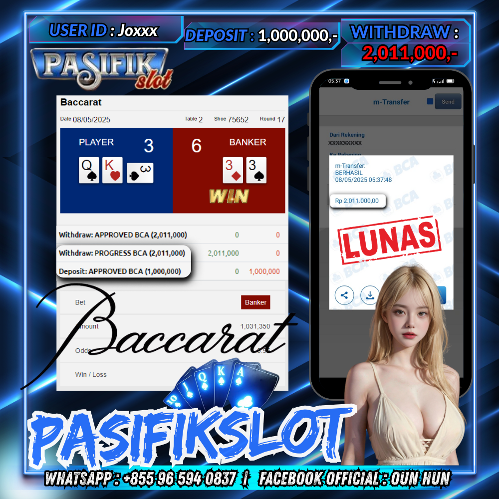 Selamat Kepada ID : Joxxx Atas Withdraw Rp. 2,011,000,- Juta Hari ini. Ditunggu WithdrawSelanjutnya dan ajak juga teman temannya bergabung di PasifikslotPASIFIKSLOT Bukti Kemenangan Live BACCARAT.